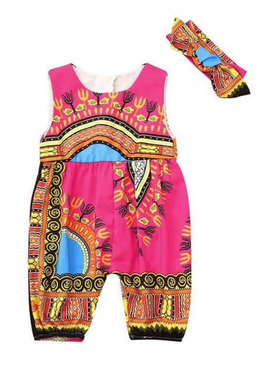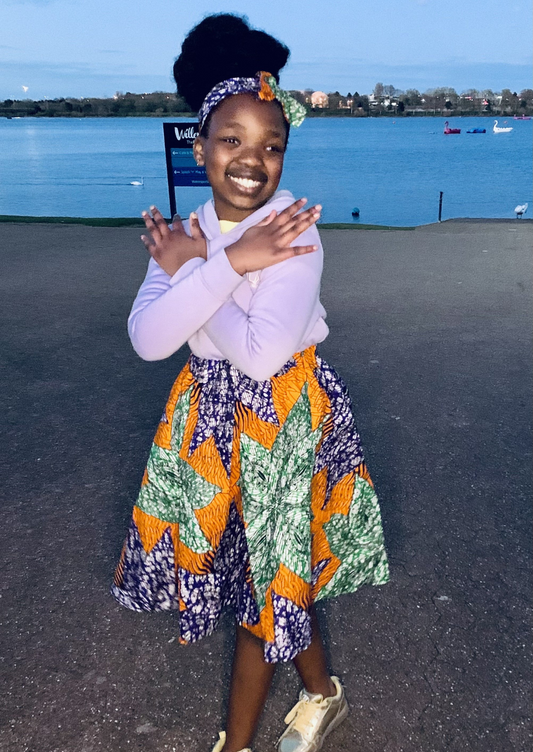 The Zola Blue Elasticated African Print Ankara Skirt and Bow Headband Set for Baby and Girls
