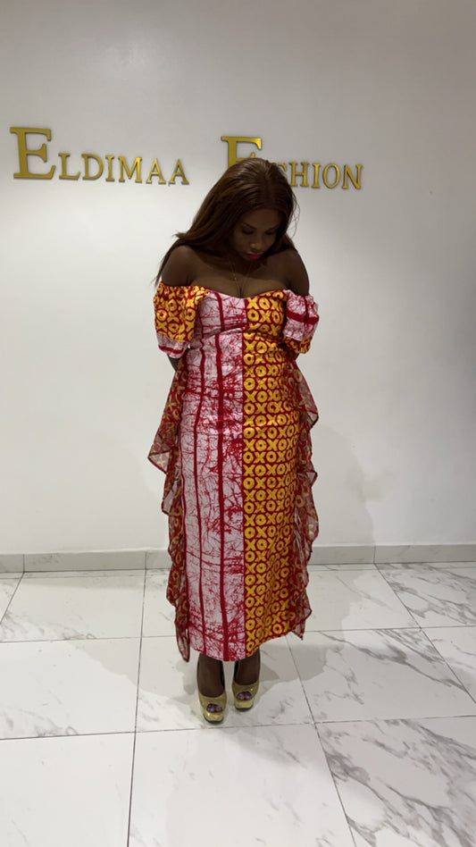 Ibeji Sexy Off-Shoulder African Print Kampala Cleavage Dress with Side Frills by Eldimaa Fashion