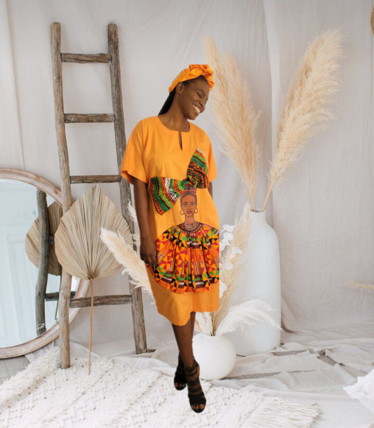 The Ngozi Melanin Woman Face Print With African Print Ankara Headwrap Dress in Orange by Eldimaa Fashion